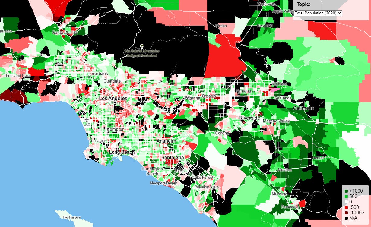 While these census maps may be somewhat dated, they offer a good assessment of LA’s demographic trends. LA’s fastest growing neighborhoods from 2010 to 2020 were Playa Vista (90% growth), Downtown (57%), Century City (23%), Chatsworth (15%), and Woodland Hills (13%). The map shows overall growth in much of LA’s Westside, the Western San Fernando Valley, and many of the newer suburbs beyond the City of LA.