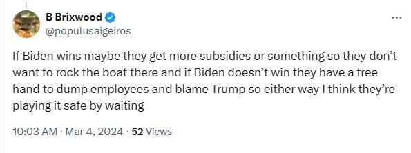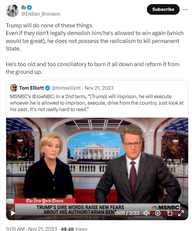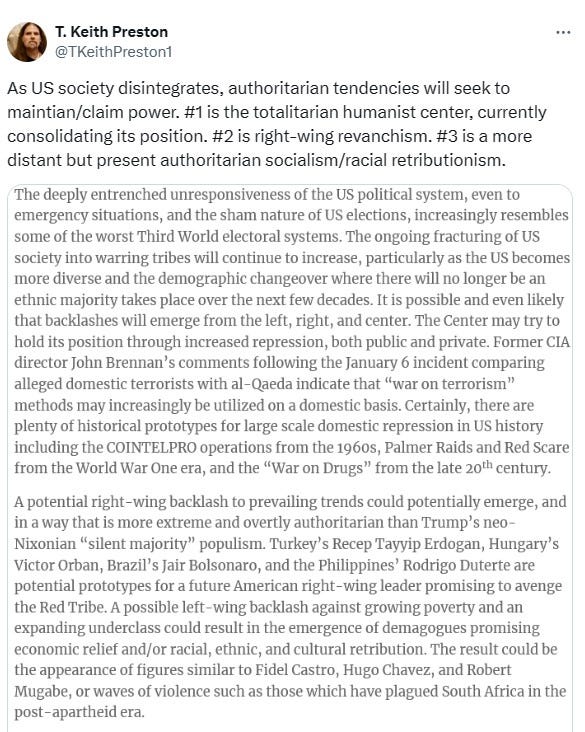 I foresee a hybrid scenario where there is almost total institutional capture but a big decline in soft power among ordinary people and Red States viewing themselves as occupied territory. We are simultaneously going to see signs of global populist uprisings, as well as signs of elite consolidation, which makes these narratives of acceleration vs consolidation seem convoluted. Out of all the potential scenarios and outcomes of the 2024 election, all are dubious regarding benefits to Americans. As for acceleration, sometimes there isn’t some big backlash or rebirth but things just get worse and stay worse.