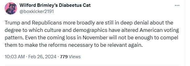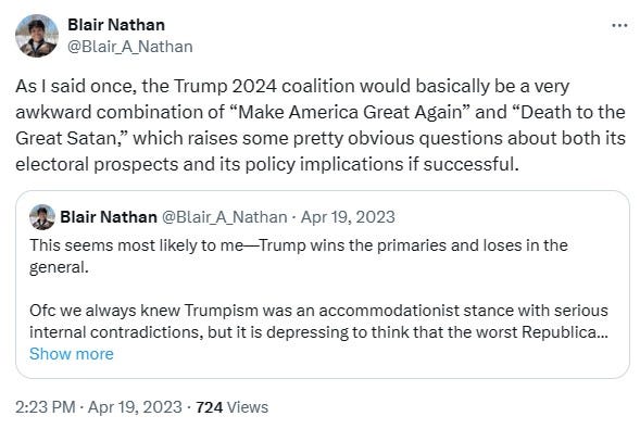 Trump has to appeal to MAGA partisans and esoteric rightists with an agenda of political revenge and institutional damage, while simultaneously convincing suburban women and right-leaning regime loyalists that he is good for the country. Trump’s 2024 campaign is turning out to be an awkward coalition of “Make America Great Again” and “Death to the Great Satan.” Trump is also making inroads with the “purple tribe” demographic that is moderate social democrat on economics and cultural libertarian, but does not particularly like woke social issues, and is also for border security. However, RFK jr. also has a strong appeal to this demographic.