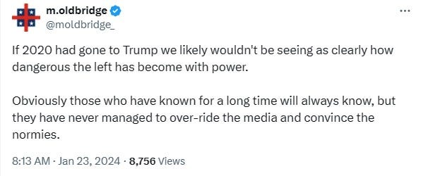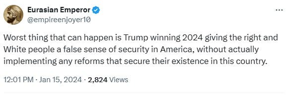 The Stop The Steal stuff is really iffy, and even if partially true, Trump lost by his own merit, as well as due to demographic change. Conspiracy theories can function as an attempt to escape politically incorrect truths, like demographic replacement. However, Trump getting elected by say a 3% margin but then denied via prosecution is actually somewhat plausible. A scenario where Trump gets elected from behind bars would be extremely chaotic, though is not the most likely scenario.