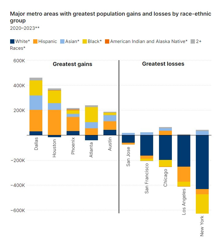 While LA and the Bay Area lost Whites the most, LA’s metro is now losing Hispanics while Asian growth is stagnating. For the Bay Area, only the Asian population is growing, albeit more modestly than in the 2010s, while the Hispanic population saw a modest decline. The Bay Area’s tech slowdown has perhaps slowed down Asian growth.