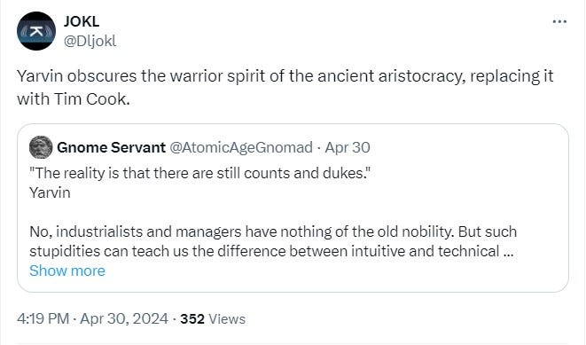 Elites must demonstrate that they can uplift civilization to have legitimacy. The elites suck but the masses don’t have what it takes to rule society either. There are countless brilliant creative people with the best ideas, who can’t get access to capital or elite institutions. Capitalism is terrible at selecting for elites and a monarchy of the merchant or managerial class with the power of aristocracy without aristocratic traits, would be the worst system imaginable. I favor something in line with Plato’s proportional inequality, where power is shared between warriors, merchants, artists, spiritualists, and workers’ guilds, to prevent one caste from totally dominating society.