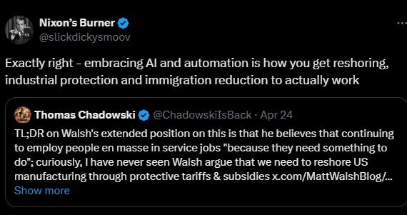 The Luddite opposition to AI is bound to fail. You can't have a moratorium on AI development without an extreme global surveillance program and free speech curtailment. Caps on hardware are the only halfway viable solution. Rightwing populists, like Tucker Carlson, are self-defeating in their call to stop AI and automation and their obsession with preserving an obsolete 20th Century economic model. Embracing automation is the only way to achieve national populist objectives, like onshoring manufacturing and reducing immigration. There are also positive benefits of automating the managerial and bureaucratic class, thus empowering both the most creative, as well as tradesmen whose jobs can’t be automated.