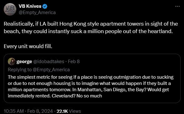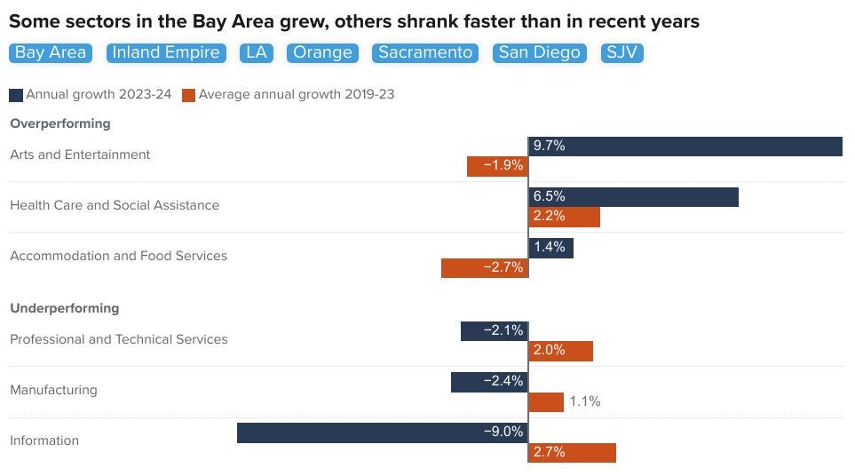 There are tradeoffs to both scenarios. Under the first scenario, California would have higher job growth, a higher GDP per capita, and a greater tax base, but hypercompetitive with a lot of displacement. Also, tech is very utilitarian and has pushed out a lot of creative types from the Bay Area, when technological and cultural innovation should ideally complement each other.