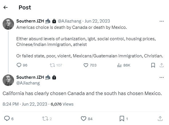 My one serious quibble is that the article assumes that Californians get to decide what happens next. This is unlikely. The US is the world's largest debtor. The largest creditors are the Japanese and Chinese. America's creditors presumably have their own preferences, as would the Mexicans. Migration, industry policy and finance all involve foreign actors and America will have no choice but to play off competing external influences against one another. How much agency Californian whites will have relative to the cartels, the multinationals, foreign governments and immigrants is unclear.