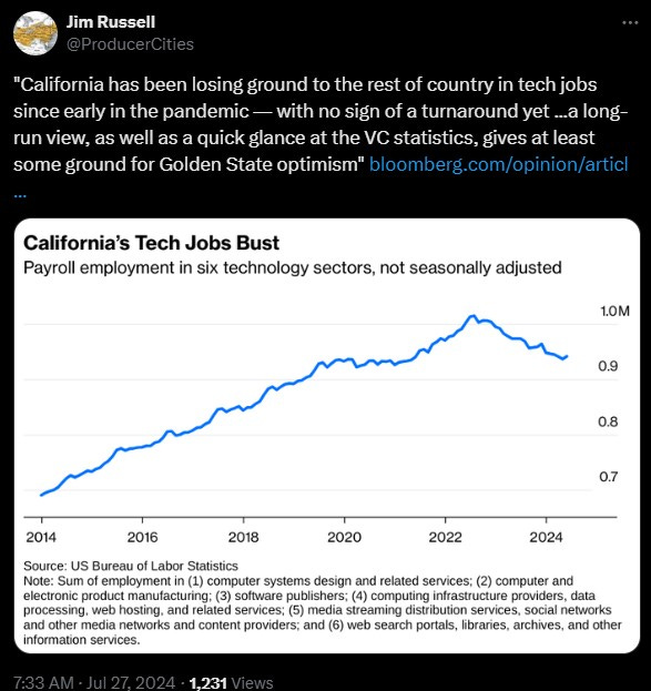 Despite tech layoffs and jobs being relocated out of California, there has been hype about an AI hiring boom in the Bay Area. What is actually happening is that AI companies are modestly expanding but tech in general is contracting. There is also this new AI safety regulation bill, SB 1047, which some predict could kill California’s AI industry. However, it would not surprise me if Newsom vetoes the bill, considering how much tax revenue and funding for California’s Democratic Party comes from Big Tech. Also, that legislation will likely harm AI startups more than big tech corporations.