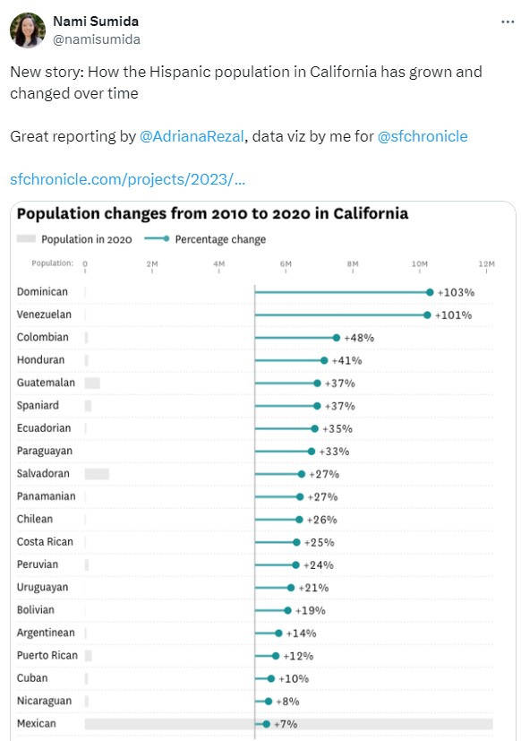 From 2010 to 2020, Venezuelans and Dominicans, who are not significant demographics in California, both doubled, and this was before Biden’s migrant wave. Colombians and Hondurans also had significant growth, with both groups increasing by almost half during the 2010s. California’s Mexican population is close to plateauing, and it would not surprise me if California’s Mexican population declines for the first time by the 2030 census. Even Salvadorians, who are California’s 2nd largest Latino group, are starting to slow down in growth.