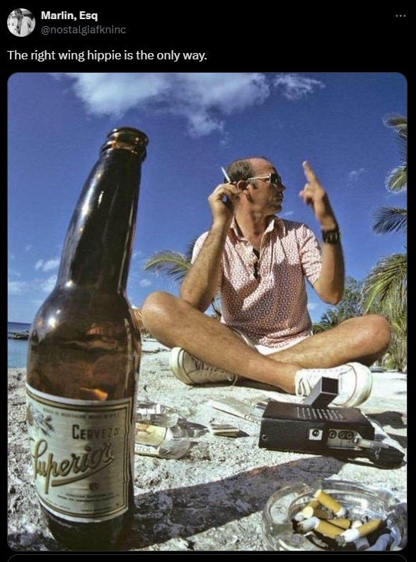 The liberal vs conservative binary does not allow for political syncretism, which is why a radical center is needed. I can appreciate ideologies and identities that seem oxymoronic, even if I don’t identify with them. For instance, Crunchy Cons, MAGA Communism, syncretic ethno-tribalism like Pilleater’s Asian Aryanism, Rightwing New Agers, Hippie, Hipster, or Bohemian Fascists, or quasi-fascists like Bronze Age Pervert flirting with crypto homoerotic imagery, which is very provocative and subversive. Not to mention, finding right-wing themes in unlikely places, like Alan Watts's speeches or David Lynch's Films.