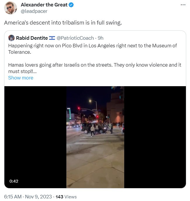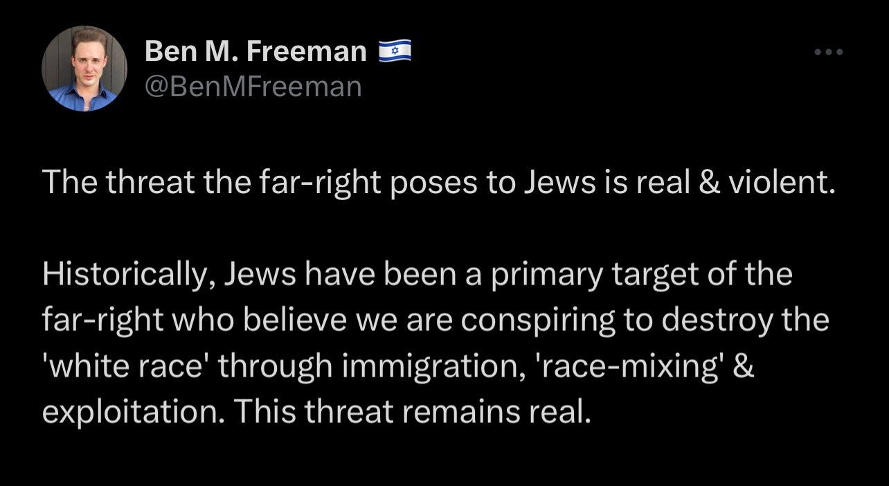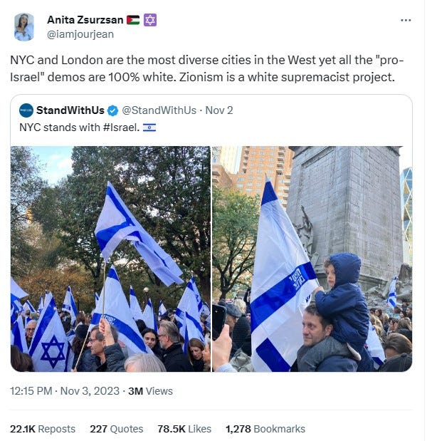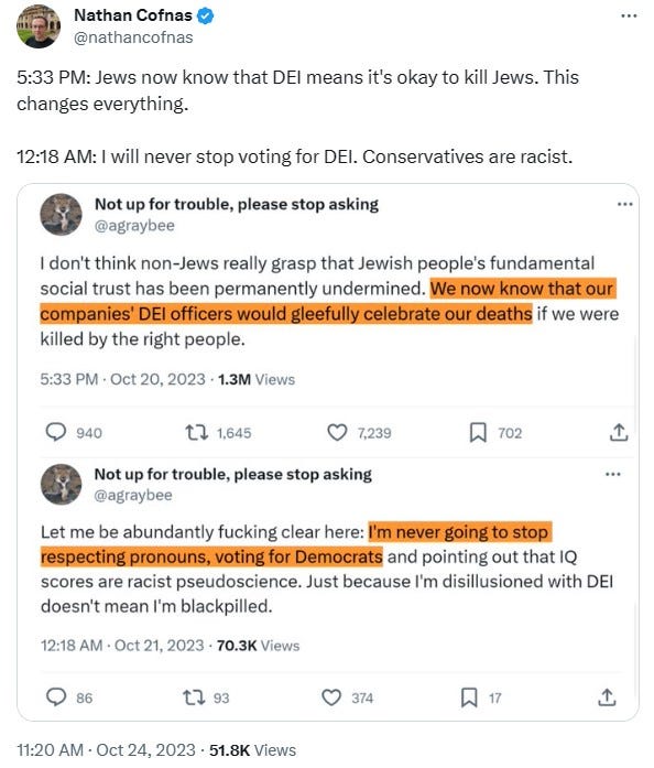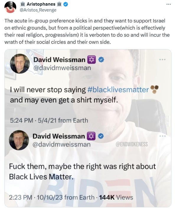 Gad Saad, who is a centrist Intellectual Dark Web type and critic of wokeness, tweeted that “Me: Well, I defend liberal democracies; I'm Jewish and I have tons of family in Israel. By the way, your name is Roscoe Jethroe, you're from Arkansas. Why do you have a "From the river to the sea" tattooed on your forehead?” The reality is that hicks in Arkansas are more likely to support Israel while anti-Israel activism is disproportionally from people of color at universities. Overall White Americans are probably the most philosemitic people on earth. While Arab Muslims are stereotyped as not being crazy about Jews, the anti-Jewish comments are from diverse POC backgrounds at elite universities. Basically the ascendant diverse managerial class whom the elites are hedging upon.