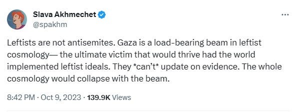 Leftism is to Western Civ what Hamas is to Israel, the death cult that dines on resentment and fantasies of revenge, with no ability to build or create, only to destroy.
