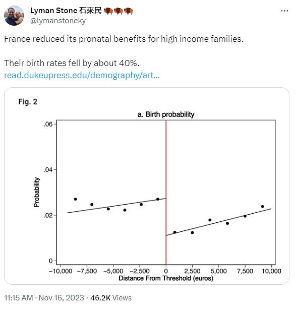 A French study on reforms to France’s childcare allowances found that among middle-income couples, cutting the early childhood benefits by half did not have a significant impact on fertility. However, among the wealthiest households, the complete removal of the benefits lead to a decline in fertility. Coercing the upper class to have more children would end up having a much greater demographic impact than populist, pro-family policies, like Hungary enacted in 2015, which have fallen short. The post pandemic corruption, favoring the wealthy, ironically had a eugenic impact on fertility. However, making earlier marriage and having kids culturally high status would probably have a greater impact on fertility than policy.