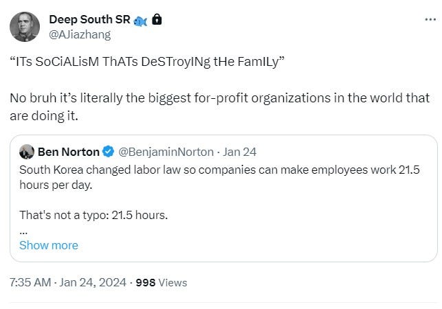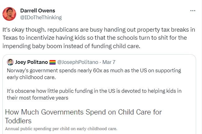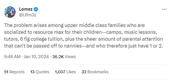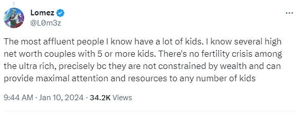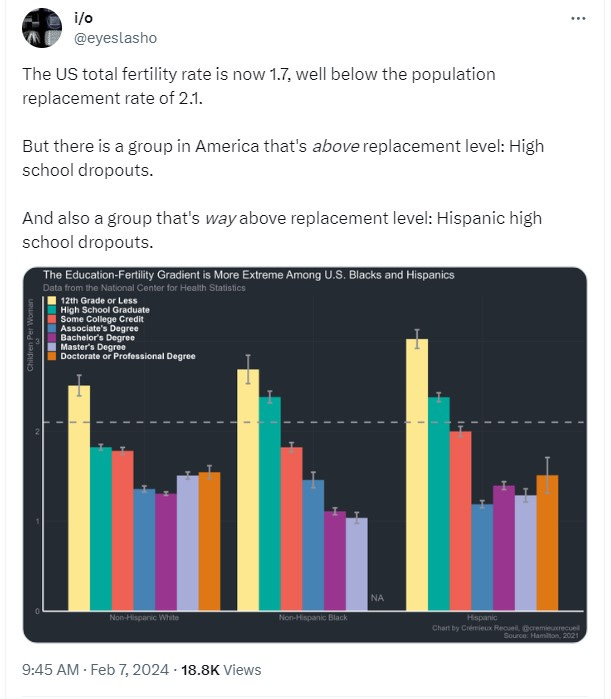 Finally, fertility crisis in the US is downstream from the failure of post-Cold War capitalism to offer a secure or dignified life for many, if not most, of its sub-elite. This is the underlying and irresolvable issue.