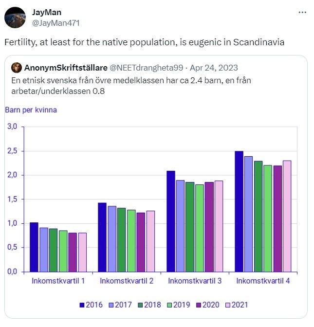 As for the poor, different versions could range from harsh negative eugenics to more programs to help the poor, such as healthcare and UBI, just favoring single adults rather than childcare. Even leftwing Indira Gandhi, made the sterilization of poor Indian men a condition for receiving government services like healthcare, which is much further than I would go. Not to mention all the pro-eugenics Progressives in early 20th Century America. Also Scandinavia’s childcare programs are slightly eugenic, under the guise of Social Democracy. If we are going to have high taxes on the wealthy to fund more social programs, there needs to be some mechanisms to offset dysgenics.