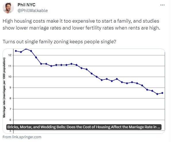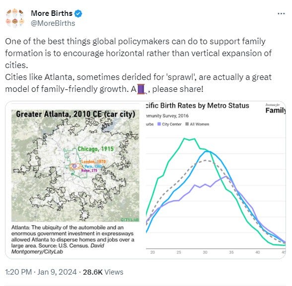 While I dislike sprawl for ecological and aesthetic reasons, building more suburban subdivisions is positive for middle class family formation. Family oriented urbanism/infill development is possible but requires access to good schools, public safety, and mandating that more new units have extra bedrooms and space. Conservatives have this notion that families cannot live in cities while the Left have made cities uninhabitable for families.
