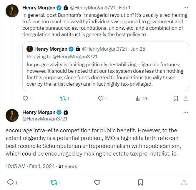 Inheritance taxation might incentivize more offspring while still allowing heirs to hold onto their wealth, which I am generally sympathetic to, except for the ultra-wealthy. On the other hand, the Class Swap could be very harsh on the wealthy, including seizing wealth and assets, plus a 100% inheritance tax on the rich. Basically the rich are coercively responsible for all the work and reproduction, while the poor work and reproduce less, but just relax off a UBI. Regardless, high fertility among the wealthy is good for reducing the concentration of wealth.