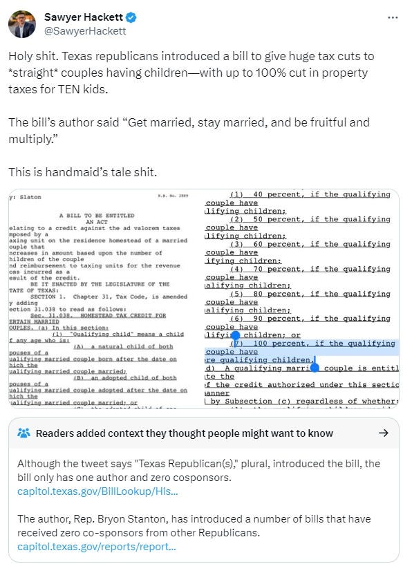 A Texas Republican legislator, introduced a bill that would grant massive property tax cuts to couples with children, with a 40% tax cut for having four children and a 100% cut for having ten children. Democrats compared this proposed legislation to the Handmaids Tale, though it looks like it doesn’t have enough support to go through. If this law were enacted in Texas, it probably would boost fertility among wealthy conservatives, and perhaps the religious middle class, with little impact on the working class and more hedonistic rich.