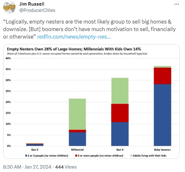 Empty Nesters now own twice as many large homes as millennials with kids. The elderly occupying vast amounts of prime real estate has a dysgenic impact on family formation. While the younger affluent are generally doing well, the shortage of larger homes has a negative impact on their fertility, especially somewhere like California. While I am not calling for raising property taxes to kick the elderly out of their homes, and having grandparents live near their families is beneficial, the scarcity of adequately sized housing in desirable areas must be addressed.
