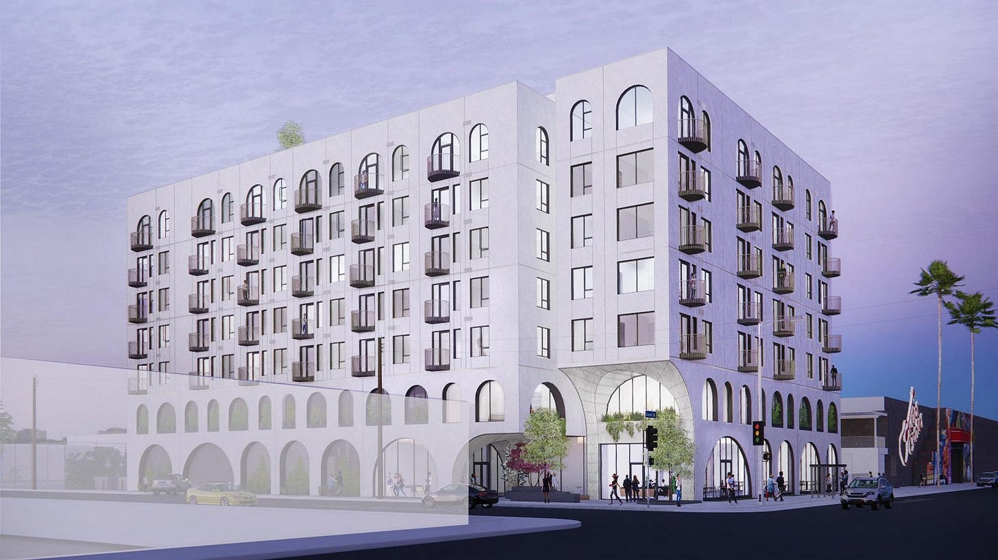 This proposed mixed-use development in Hollywood, as well as a very similar looking project at La Brea in the Mid-Wilshire district, shows another emerging architectural trend. These mixed-use projects are usually white, with curved arch doors and windows, and have an eclectic range of influences from Streamline Moderne, 1960s and 70s, as well as Italian architecture. All of these recent projects are a vast improvement over the type of midrise development that LA and other metros have built over the past decade.