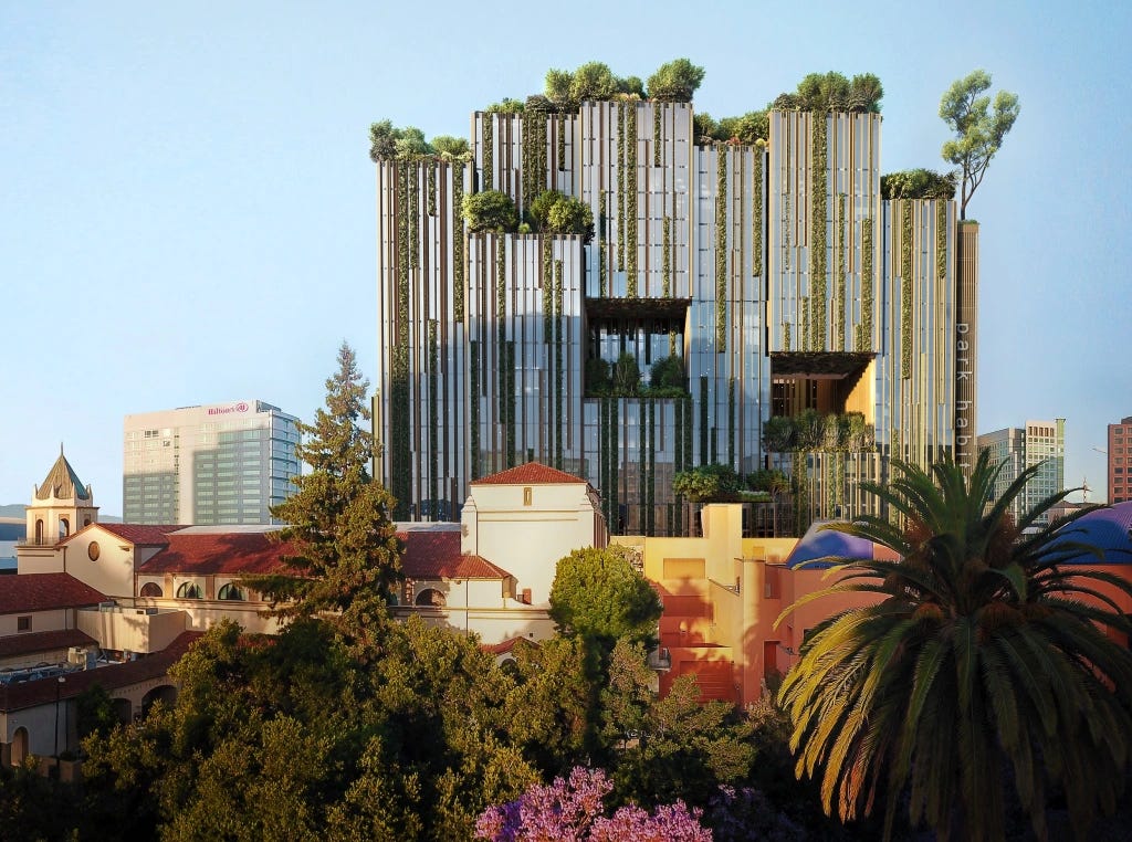 The timber high-rise’s counterpart is the garden tower, with a lot of potential fusionism between these genres. The garden tower is relevant to the popularity of the genres of Eco Brutalism and Tropical Brutalism, which are sort of online fantasy genres, tied to utopian visions for an ecologically sustainable future. Garden towers are most associated with Singapore, though still fairly rare in North America. However, there are an increasing number of very ambitious proposals throughout the West. One such proposal, is the very posh Aman hotel complex in Beverly Hill, which is a cross between the Singapore and Miami aesthetic. Other proposals include, a mega development on Squamish Nation reserve land in Vancouver Canada, and the Park Habitat office tower in San Jose. Even a proposed renovation for the Transamerica building in San Francisco’s financial district has aspects of this genre, and makes the best of, rather than erases, the existing 70s brutalist aesthetic. These projects are very futuristic and cutting edge, though tend to be expensive to build, especially taking into account the impending recession. Not to mention, they tend to be marketed to the ultra-wealthy.