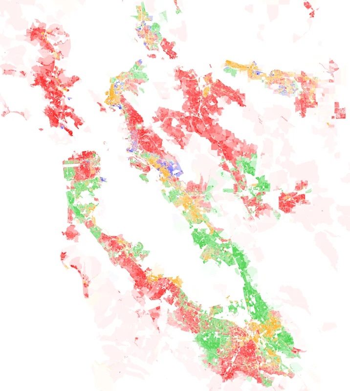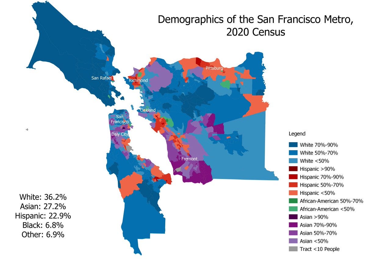 Overall, “the Bay Area is 35.8% non-Hispanic white, 31.4% Asian, 24.4% Latino or Hispanic, and 7.4% Black.” The region is remarkably diverse with close to balanced proportions between Whites, Hispanics, and Asians, yet still plurality non-Hispanic White. In contrast, the LA metro is plurality and just shy of majority Latino. Demographic maps show how the region resembles a quilt-like patchwork or mosaic, broken up into a series of demographic blocks.