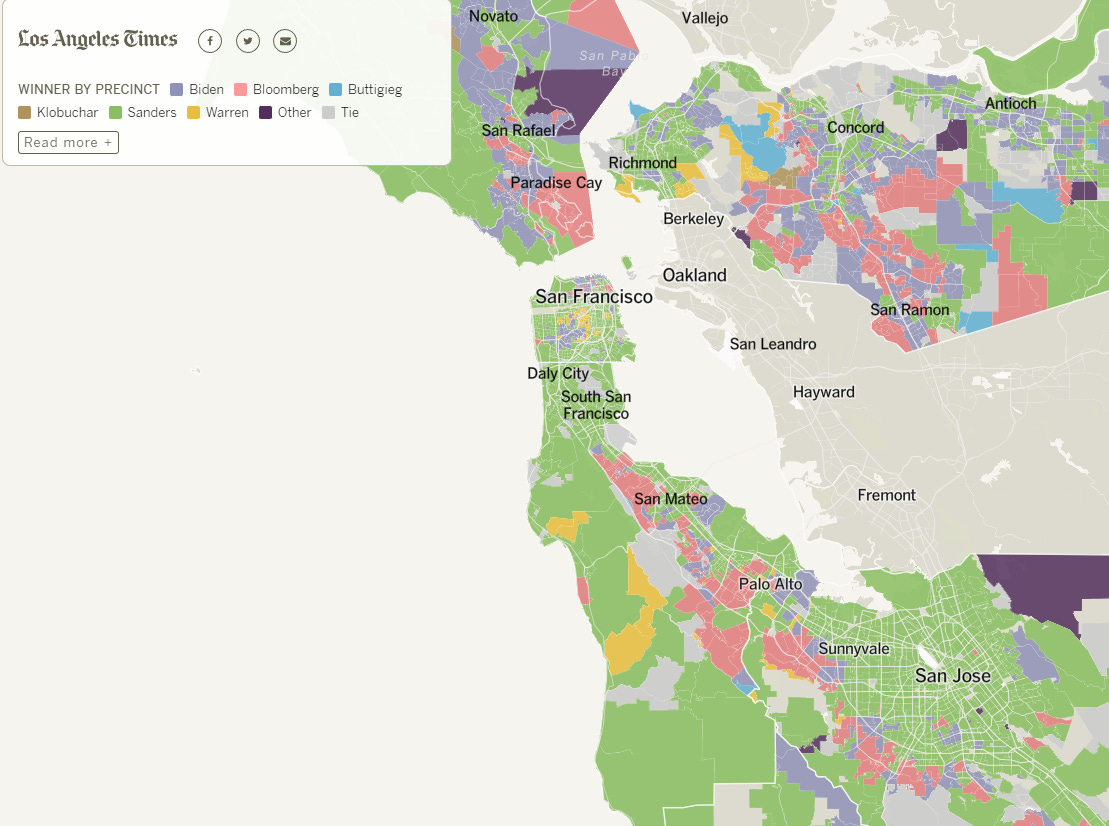 There is more nuance to the image of the Bay Area as a blue monolith. In the 2020 Democratic primary election, affluent suburban White communities were divided between Joe Biden and Michael Bloomberg, and Asian areas were divided between Bernie Sanders, Bloomberg, and Biden. Sanders’ strength was in urban areas, Hispanic areas, much of the Silicon Valley, and even pockets of support among wealthy areas in San Francisco and Marin. Elizabeth Warren’s support came from areas most stereotyped as leftwing but more affluent than those for Sanders. With the 2020 general election, Biden won overwhelming, with much of San Francisco, Oakland, and Berkeley voting for Biden by 80-90% margins. Trump’s only strong support was in rural far eastern Contra Costa County. However, Biden only won by narrow margins around Alamo and Danville, which used to be a “Country Club Republican” stronghold that turned blue in the 2010s.