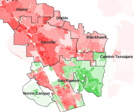 I'm from Windsor, live in Petaluma now. A lot less families in Windsor now than in the past. I used to live in Berkeley and SF. Since whites are more concentrated in Walnut Creek I guess that explains why I used to prefer to go out to eat there when I lived in Berkeley. What's interesting about this is how we all self-organize, almost intuitively, without conscious thought as to why we chose to live in one place over another. And being from a sprawly area, I have always found places like Daly City, Albany, Richmond etc.. to be incredibly depressing, and I can't entirely figure out why, but I think it has to do with the denser housing.