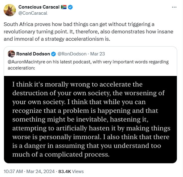 One bright spot: this article does highlight the evil of "accelerationism." Accelerating into a brick wall only produces WORSE violent damage to those involved, not a shorter path back to civilization. But what's truly missing in this article and 98% of others is a sense for the fragility of civilization. California shows us that the appearance of order can be much, much more durable than a civilization worth living in. South Africa shows us that non-systemic genocide can be much, much more deniable than people would like to admit.