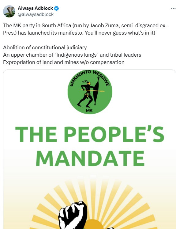 With this year’s election, there is a power vacuum with the ruling party, the African National Congress (ANC), plunging in support. This election will likely be the first ever that the ANC fails to get over 50% of the vote. Under a Parliamentary System, the opposition parties are also very fractured, with the main parties being the neoliberal centrist Democratic Alliance, which represents minorities, the EFF, and former president Jacob Zuma’s MK Party, which represents Zulus and is very radical. There is also a rightwing Zulu party, the Inkatha_Freedom_Party and an Afrikaner Nationalist Party, Freedom Front Plus. Since the ANC will be forced to form a caucus, caucusing with the DA could have a moderating or decelerationist impact while caucusing with either the EFF or the MK Party, or perhaps both, will push South Africa’s regime in a much more radical and militantly anti-White direction. For instance, land appropriation without compensation.