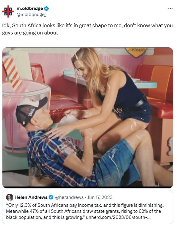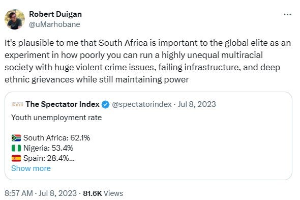 South Africa is experiencing a slow-motion collapse and has taken much longer to collapse than many anticipated. South Africa is an 80% Black country that is very “Woke” by non-Western standards, so it should have long since collapsed by all metrics, according to Western right-wingers but somehow it hasn't. If South Africa does not collapse, it totally discredits accelerationism and shows how long the American system can be sustained with a managed decline. South Africa serves as a grim reminder about how dysfunctional and shitty a State can be while still existing and exerting power over the populace.