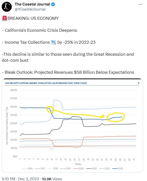 Peter Zeihan has a video about why California’s lucky streak is running out. Zeihan points out that immigration is no longer enough to offset California’s ageing population. The other point is that since California’s economy is so heavily linked to globalization, both tech and the shipping industry, its economy will be harmed tremendously by deglobalization. Plus sustained interest rate hikes will hamper the tech industry. California now has a massive budget deficit ($68 billion), after recently having a record surplus. This is mostly due to declining tax revenue, which is a recessionary signal.