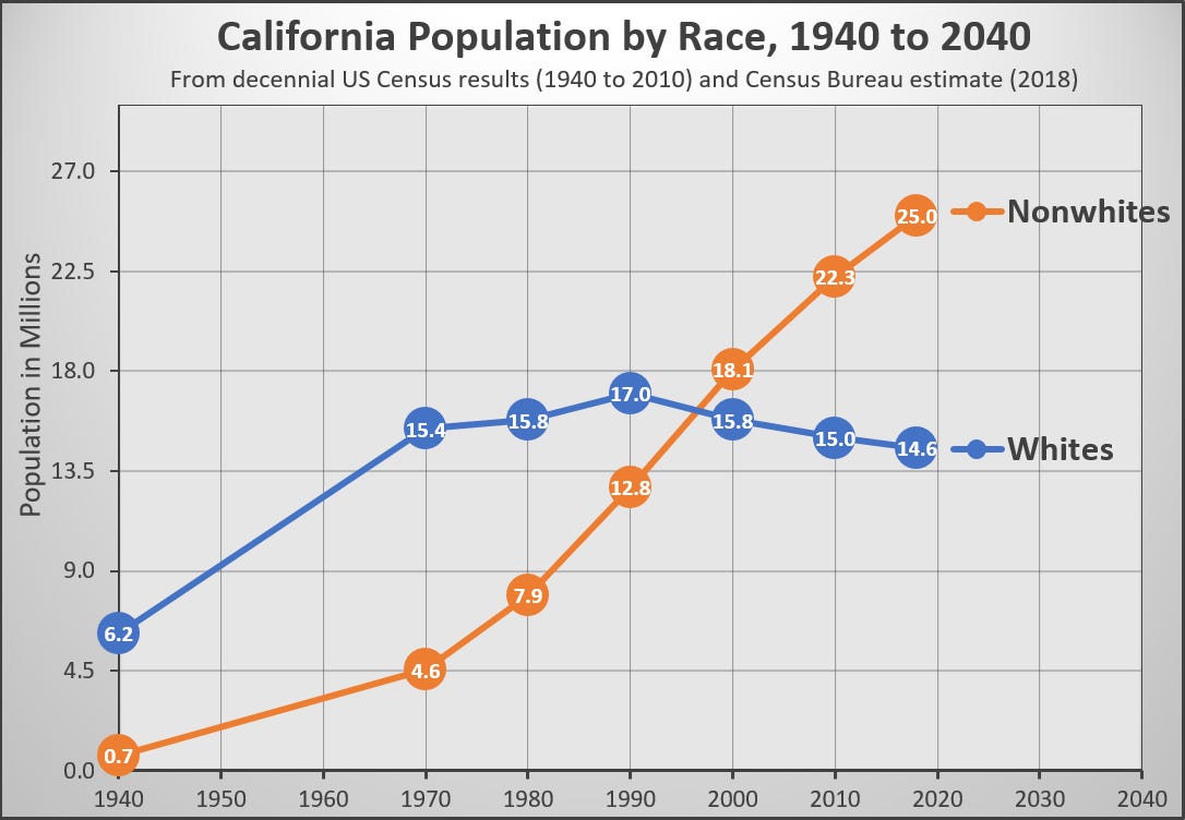 While White demographic decline looks especially terrible from a percentage basis, it is not as bad numerically. For instance, Whites went from 76% in 1970 to about 40% today, though the youth population is closer to 30% White. Numerically, White Californians declined from a peak of about 17 million in 1990, to 14.6 million today, and are expected to hit 13.7 million by 2050. After the current exodus and big drop in the White population, from when the Boomers are gone, I don’t predict endless White decline but rather some stability. Perhaps a plateau at around 13 million, as Whites who remain will be the most resilient and adapted to California.