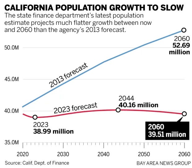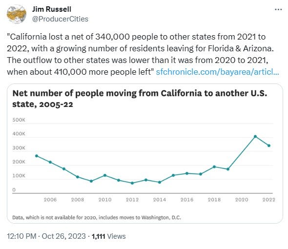 California lost a net of 340k people to other states in 2021, and an estimated 871k left in the year 2022 alone. After long concerns about overpopulation, new projections show California’s population remaining about the same until 2060. In contrast with the Rustbelt or even New York, California has managed to sustain past recessions without losing significant population. Until very recently, California has benefited from other parts of the Nation’s exoduses. During the Great Depression, California was a magnet for transplants from all over America, especially those fleeing the Dust Bowl. Then many New Yorkers relocated to LA in the 70s. With this recession, or perhaps depression, California could end up being significantly worse off than the rest of the Nation.