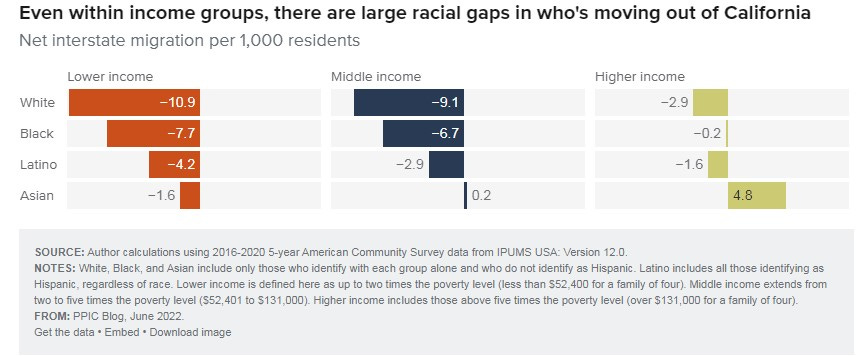 The 2008 recession/foreclosure crisis pushed a lot of the remaining working class Whites out of California, especially in places like the Inland Empire, but also the remaining downscale White renters in urban areas. A study from the Public Policy Institute of California showed that downscale Whites are already the demographic most impacted by the exodus. I predict that this recession will push out much of the remaining working class Whites from California.