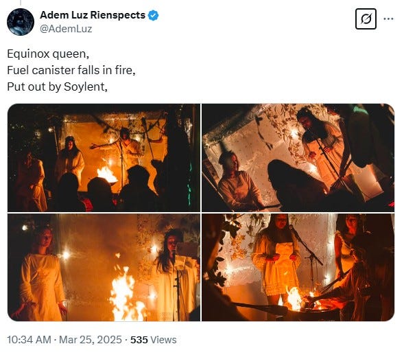 I am biased because I am friends with Matt and Dan, who run New Ritual Press, and they will likely publish my work. Regardless, I am very optimistic about their endeavor, and I see its potential to go beyond an independent online publishing company to a cultural institution, as well as a party venue. The event was a cultural breakthrough and lived up to the Spring Equinox’s symbolism of rebirth. Certainly, it feels like LA, which has gotten a lot of negative publicity over the past several years, is a good spot to be in 2025 for this kind of thing.