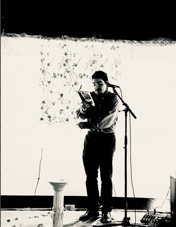 Omar’s An Odyssey Of Dingbats! is the first book published by New Ritual Press. It is a collection of short stories that are surreal and filled with dark and off the wall humor. Since Omar comes across as wholesome, the audience may be caught off guard when he reads the more graphic sexual parts of the book. For instance, an anthropomorphized hopelessly romantic crayon who witnesses a femdom/gimp slave relationship, a story of an aging and emotionally broken, albeit coping, former starlet, who recounts the trauma of forced casting couch fellatio, a story about overhearing a man talk about fellatio and eating pussy in a public restroom, and a true story of wandering off from a vocational program at a Costco parking lot and witnessing the horrors of car fellatio, which Omar describes it as if he saw the devil.