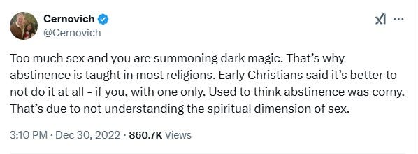 While there is a spiritual component to sex, finding spirituality through celibacy or asceticism is also valid. The Dharmic, Hindu or Buddhist, view is that asceticism or celibacy is a way to detach from the material to become closer to the spiritual realm. I consider the Catholic Church’s celibate priesthood to be dysgenic and prefer the Buddhist model where monks are only celibate temporarily.