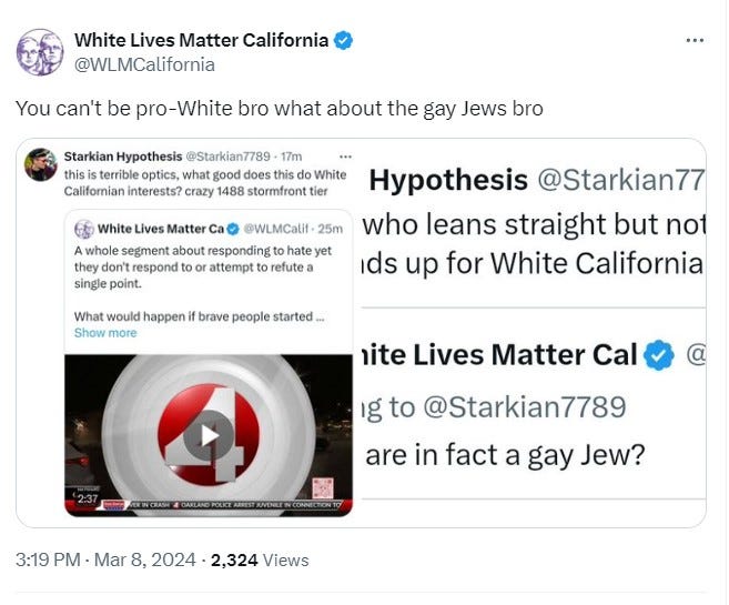 I called out White Lives Matter California on their rhetoric on X and all they could do was denigrate me for being of partial Ashkenazi Jewish ancestry. It is not like I get personally offended by anti-Semitic remarks, I just find the obsessive and conspiratorial Jew-hating to be counter-intuitive, especially in the context of California. I am only 1/16th Jewish, though I will bring it up to troll the 1488 types. The Jewish side of my family history actually immigrated to the San Francisco Bay Area in the late 19th Century.