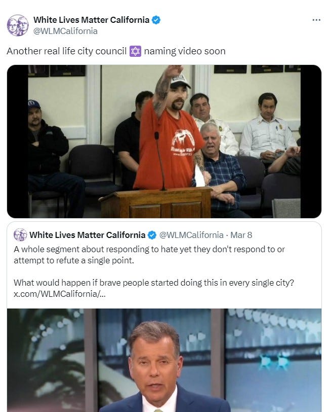 CBS News Bay Area reported that “Antisemitic speech has prompted the city of Walnut Creek to join other Bay Area cities in shutting down online and phone-in public comments during public meetings. CBS News quotes Walnut Creek City Councilman, Kevin Wilk, stating that “it's a strategy of far-right, white nationalist groups like White Lives Matter California, who use locally broadcast public forums to broadcast their messages. Wilk has often been mentioned by name by callers, who Wilk said typically use pseudonyms like "Eddie from Walnut Creek" and don't show their faces over Zoom. A few years ago NBC Bay Area reported that banners in Walnut Creek displayed slogans such as "It's OK to be pro-white" and "White Lives Matter."
